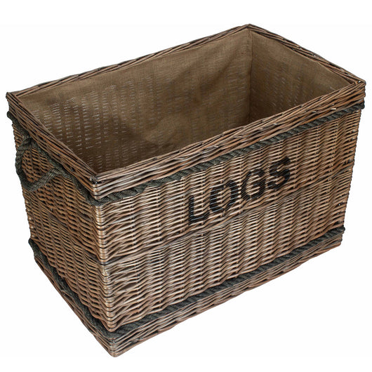 Carefully crafted from full antique wash finish willow, this sturdy and large log basket features rope handles on each end and the word "LOGS" is sprayed onto the basket.